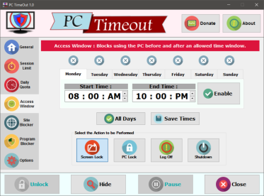 Block the usage of a PC before and after a specified allowed time window. No early mornings or late nights.